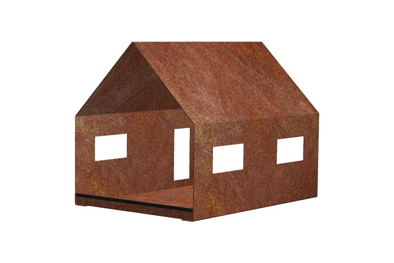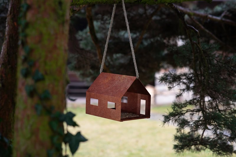 Krmítko CASA ve tvaru domečku. Odolná cortenová ocel se závěsným lanem.