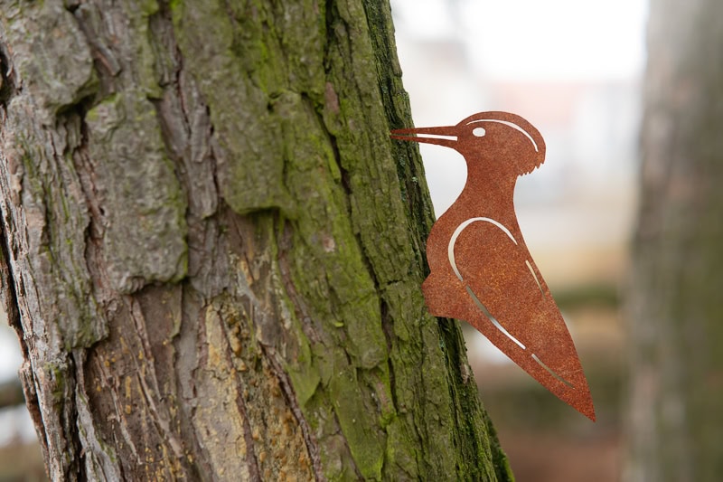 Detailně zpracovaný datel z 1 mm cortenové oceli. Působí přirozeně, jako by právě klepal do kůry. Spodní montážní plech pro bezpečné uchycení na stromy či pergoly. Odolává všem vlivům počasí.