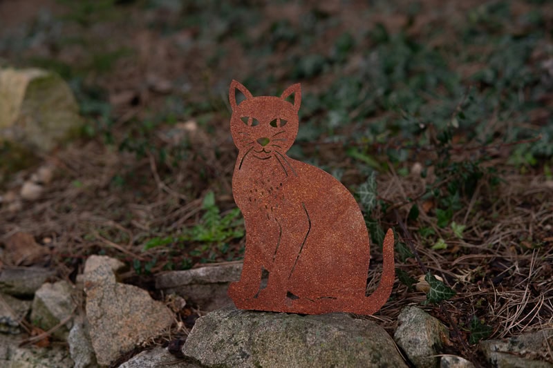 Sedící kočka s přátelským výrazem z 1 mm oceli COR-TEN®. Integrovaný montážní plech dovoluje zapíchnutí do záhonu nebo uchycení na zídku či pařez. Patina přirozeně ladí se zelení.