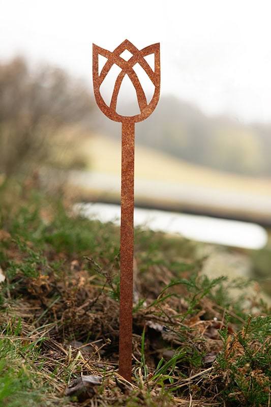 Elegantní tulipán z cortenové oceli. Zapichovací symbol jara.